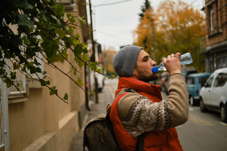 Young man in a red vest and beanie drinks water from a plastic bottle while standing on a quiet city street in autumn