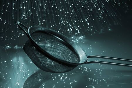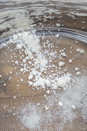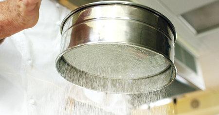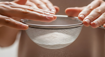 A closeup of a woman sifting a flour through a little sieve. A woman holding a little sieve to sift a flour