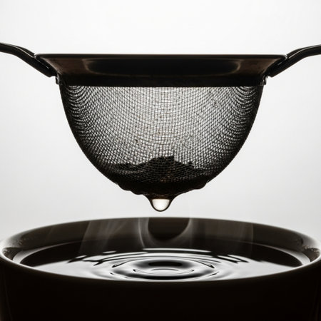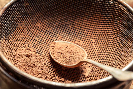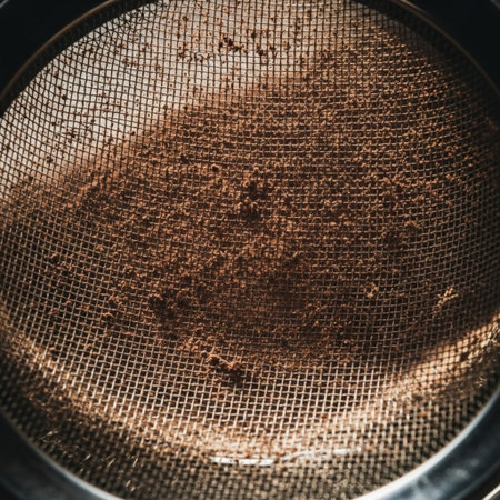 Macro shot of a used fine-mesh sieve strainer covered in cocoa dust, lit by harsh cinematic sunlight