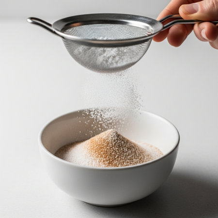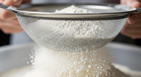 A close-up shot shows hands holding a metal mesh sieve and sifting fine white flour into a bowl below, which is already partially filled with flour. The flour cascades down, creating a dusty cloud. This action is a common step in baking to aerate the flour and remove lumps.