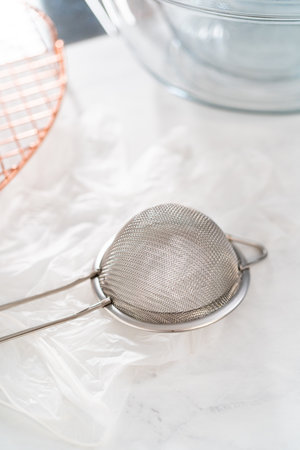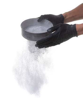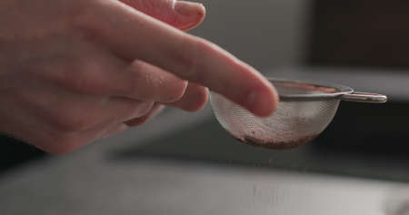 Person adds flour to a pastry through the strainer. Vertical studio shot.