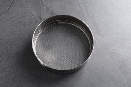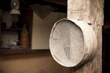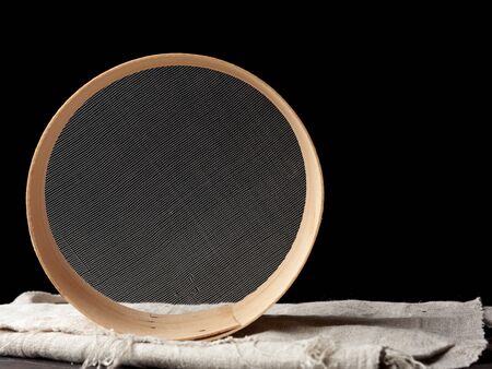 round wooden sieve on a black background, outdated kitchen utensils, copy space