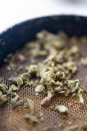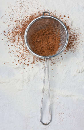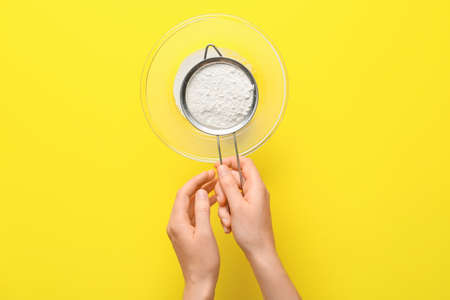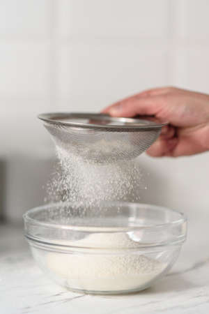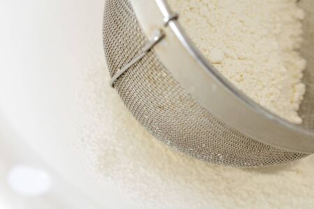 Close-up of a woman's hands sifting flour through a flour sifter. High quality photo