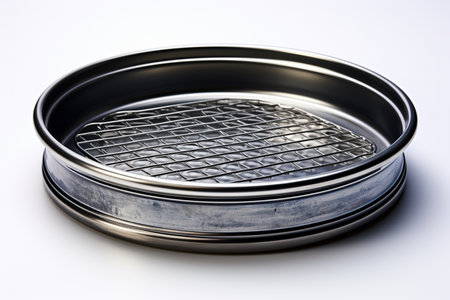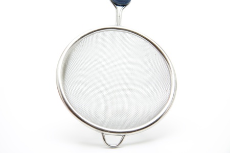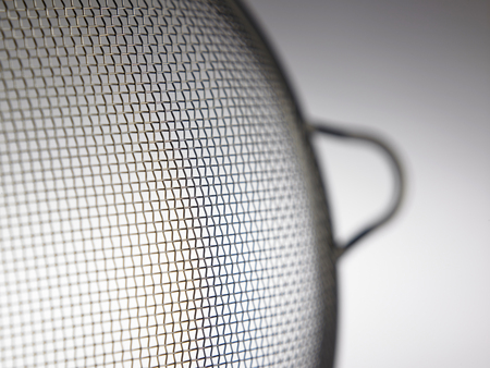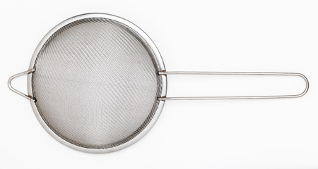 Shiny stainless steel metallic detail strainer isolated in a white minimalist kitchen.