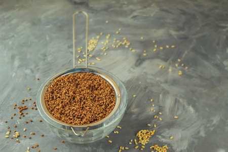 Raw buckwheat lies in a small strainer, and pearl barley and part of buckwheat are scattered around on the table