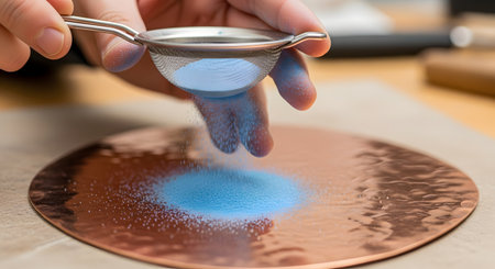 A close-up of an artist's hand using a small sieve to carefully sift fine blue enamel powder onto a hammered copper disc. This is a crucial step in the traditional craft of enameling, preparing the metal for firing in a kiln to create a glassy, fused surface.