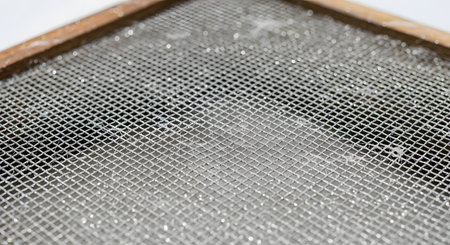 A close-up of a wire mesh screen with a wooden frame, likely used for papermaking or sifting materials. Small droplets of water or pulp are visible on the fine grid, highlighting the texture and pattern of the mesh.