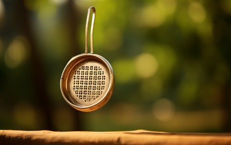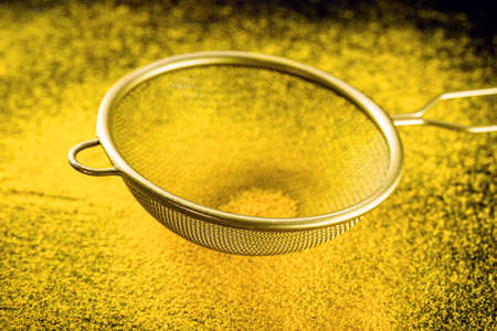 golden metal strainer, over yellow powdered seasoning, curry, saffron or ground mustard