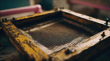 A rustic wooden frame featuring honeycomb mesh, illuminated by soft natural light, captures the essence of vintage craftsmanship in a workshop setting.