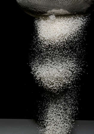 male hand holding a strainer with white powdered sugar and sifts on a black background, close up