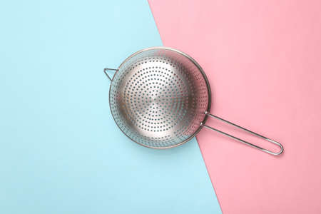 Top view of Stainless Steel Soup & Juice Strainer or Liquid Filter with handle isolated on pink background