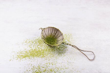 Vintage metal strainer with Matcha tea. Top View. Copy Space