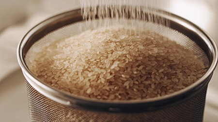 Uncooked white rice grains are being rinsed in a mesh strainer, with water cascading over them in a modern kitchen setting.