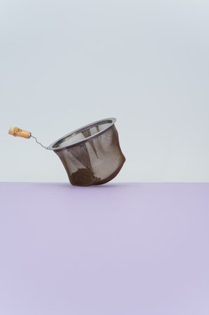 Metal strainer for coffee and tea on a white background. Making tea and coffee. Hot drinks. Kitchen tool. Filter. Home kitchen. Background image. Place for your text. Template.