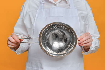 A metal sieve is in the hands of a woman in the kitchen. Female hands holding a small strainer