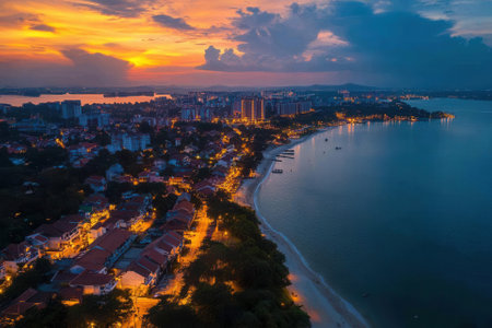Aerial view of coastal city at sunset.