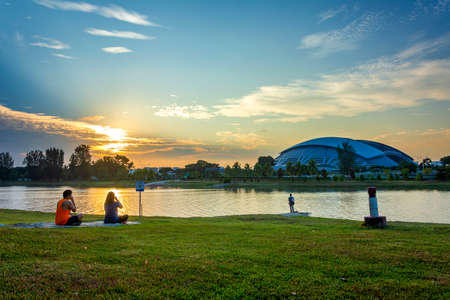 2019 March 1st, Singapore, Marina Barrage - Panorama view of the city buildings and people doing their activities at sunset..