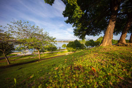 The English garden at Putrajaya, Malaysia, for sunrise. Golden grass around an old tree in the morning sun. The Putrajaya lake and the skyline of Putrajaya in the background. Truly Asia.