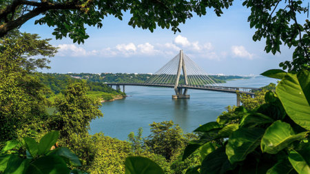 A stunning view of a modern bridge spanning a tranquil river, surrounded by lush greenery and blue sky, perfect for nature and travel enthusiasts.