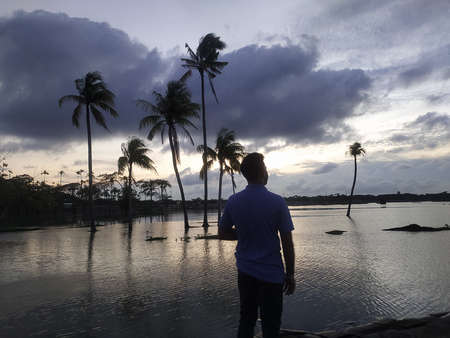 Silhouette of a man standing in front of coconut trees on the shore of a lake at sunset.