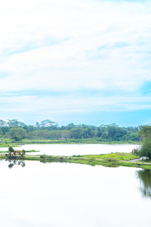 A landscape scenery with a lot of trees, a lake, and a blue sky with some visible cloud
