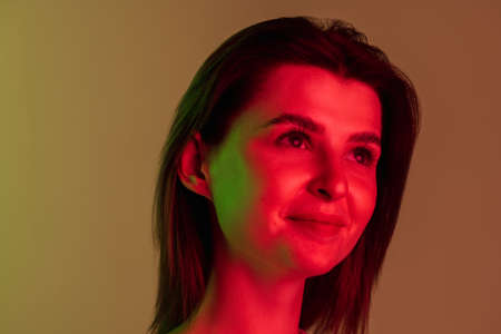 Close-up portrait of young Caucasian girl isolated on light studio background in neon light. Concept of human emotions, facial expression, cosmetics, youth
