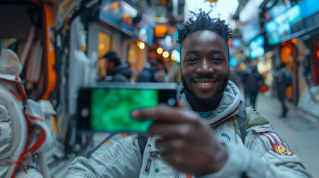 Young astronaut smiling and taking a selfie in a vibrant futuristic city market, capturing the moment.