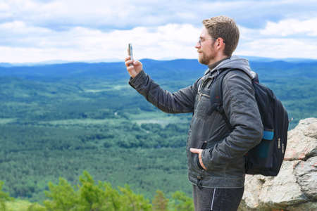 Caucasian male hiker taking pictures with cellular device of beautiful mountain top