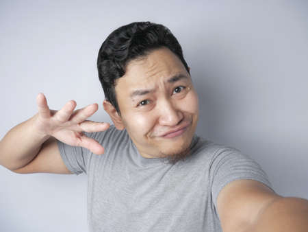 Portrait of young Asian man smiling while taking selfie photograph of himself on his smart phone with funny expression