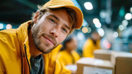 Delivery worker in yellow uniform with parcels at logistics warehouse, portrait in distribution center.