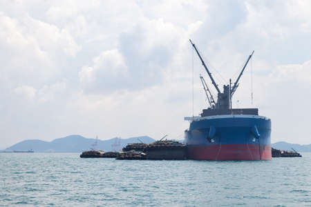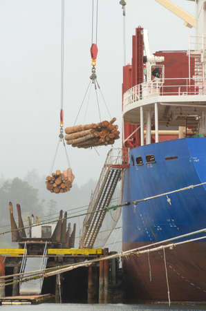 A large commercial ship being loaded with fir logs for export to Asia on the docks in Coos Bay and North Bend Oregon