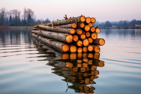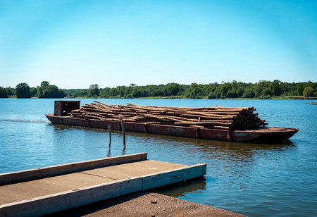 A barge laden with neatly stacked timber glides across a calm river, under a brilliant blue sky. The lush greenery along the shore adds to the peaceful atmosphere of this scenic location.