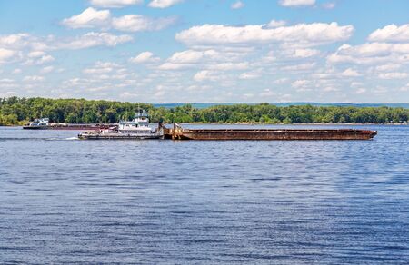 Samara, Russia - June 2, 2019: Cargo barge floats along the river on a sunny summer day. Cargo ship floating