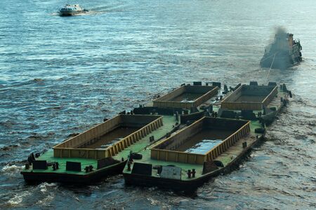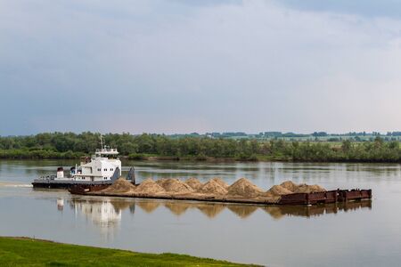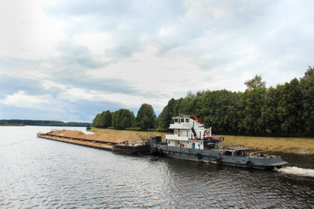 barge with sand floats along the shore along the river. view of a cargo tugboat, a barge, a motor ship. Logistics of water transport and shipping