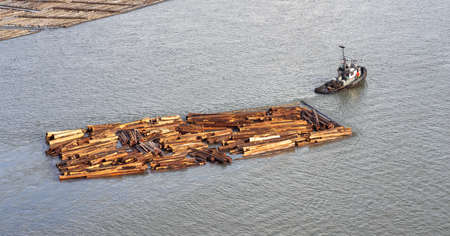 Logs pulled by a tugboat on Fraser River. Aerial View from Port Mann Bridge in Greater Vancouver, British Columbia, Canada.