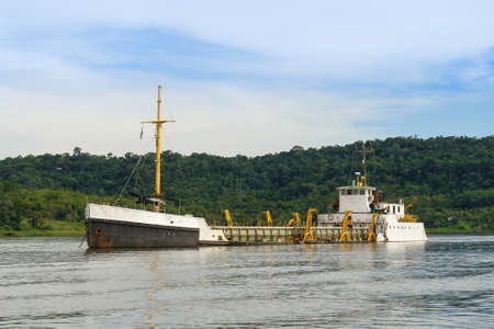 A river vessel extracts sand from the bottom of the river. Cleaning the river from mud
