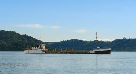 Large cargo barge in sea. Large tugboat anchored to avoid monsoon storm at back of island. Tugboat cargo carry products. Importance of river transport in transporting goods and developing economy.