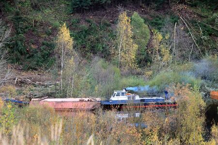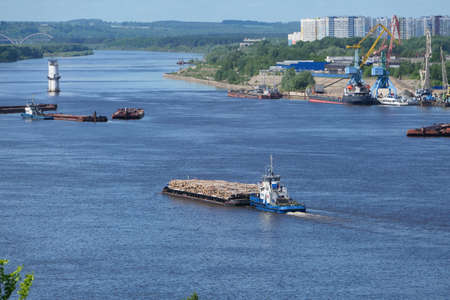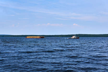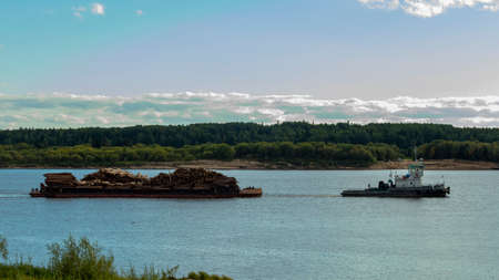 The barge transports cargo, timber logs along the river in summer. High quality photo