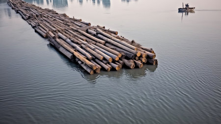 Aerial view of floating cargo transportation by construction materials transported building pipes and metal structures on barges