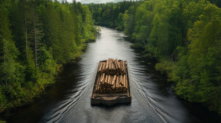 Log Barge Transporting Timber Through Lush Forest River During Daytime