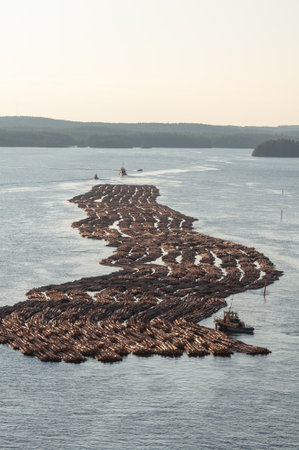 Transportation of wood by water. Raw logs floating down the river. Timber rafts, logging. Tugboat pulling log boom. Finland.