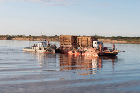 River ferry carries a truck loaded with logs on the Northern Dvina near Krasnoborsk, Russia. Summer time, sunset