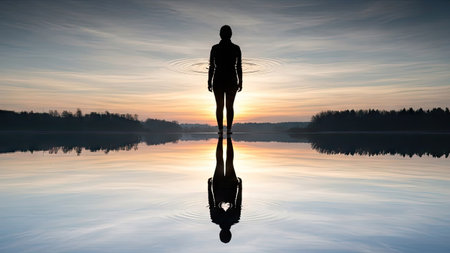 A silhouette of a person standing in still water against a sunset backdrop. The image features reflections, creating symmetry. The sky showcases hues of orange and blue. This photograph is appropriate for various commercial applications, including editorial and marketing materials.
