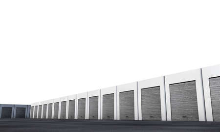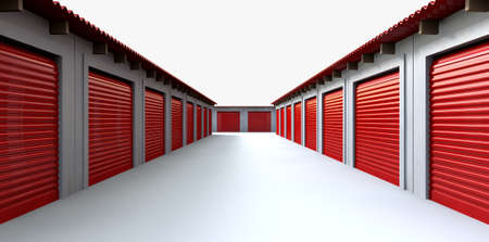 A perspective view of a row of storage rooms with closed red roller doors on an isolated white background
