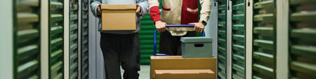 Two middle aged men, one Caucasian and one Black, carrying and pushing cardboard boxes through storage facility corridor, collaborating on moving or organizing belongings