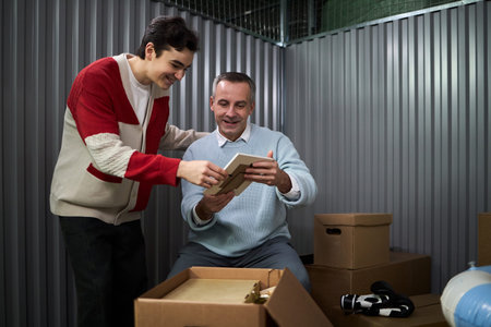 Caucasian teenager standing next to middle aged Caucasian man sitting and opening cardboard box together, both smiling and interacting in storage unit surrounded by moving boxes