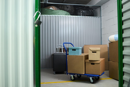 Storage unit containing cardboard boxes and suitcase on blue hand truck, metal walls and concrete floor visible, open door with padlock hanging, no people present