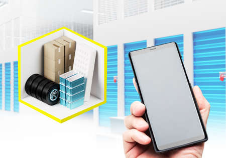 Demonstration of storage unit with things. Smartphone with blank screen in hand. Place to warehouse advertise on the gadget screen. Rent storage facilities via mobile application. 3d image
