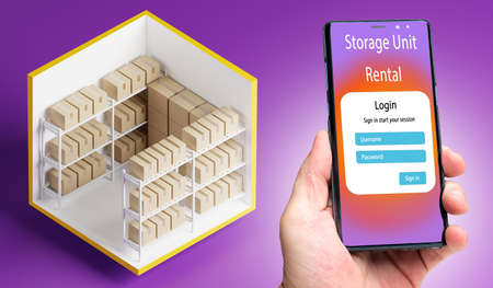 Storage Units rental. Storage Units cutaway with boxes of same type. Phone with warehouse app in hand. Storage container on purple background. Metaphor renting space for business warehouse.