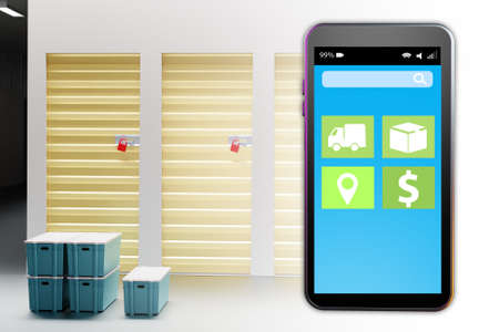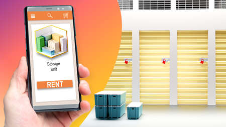 Rental Storage Units. Application for renting warehouse. Smartphone front storage containers. Self unit rental at warehouse company. Storage doors and drawers in background. selective focus. 3d image